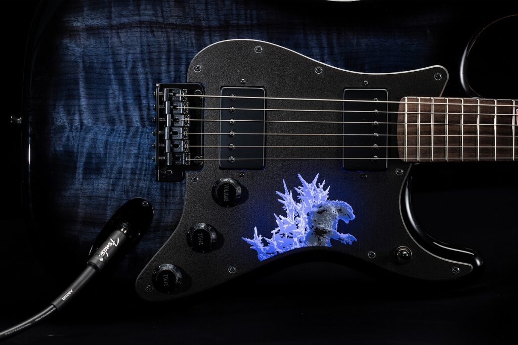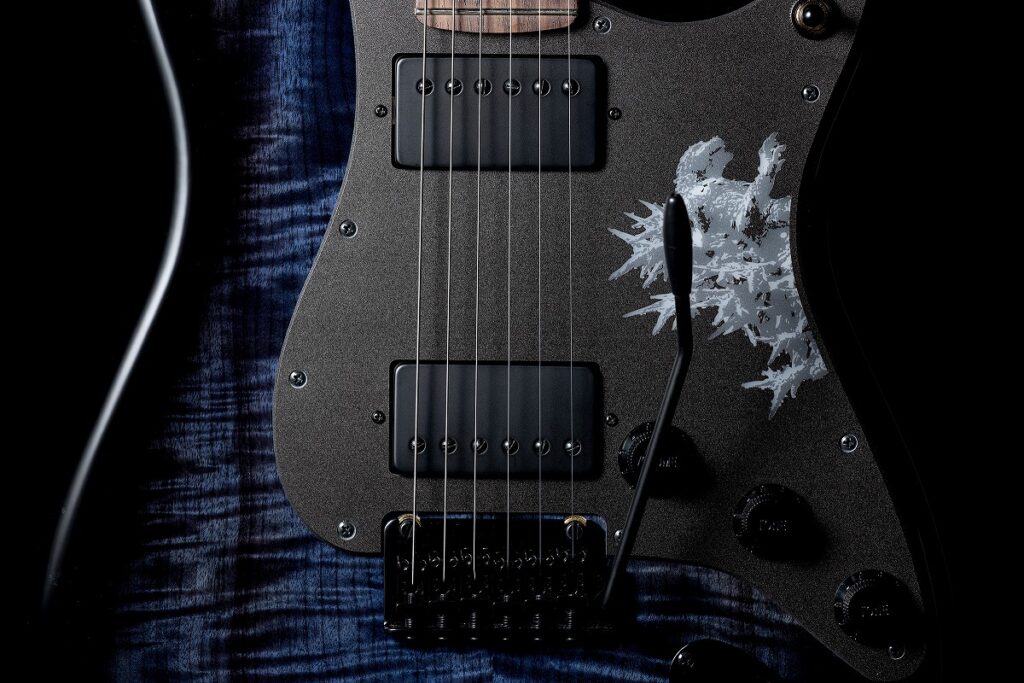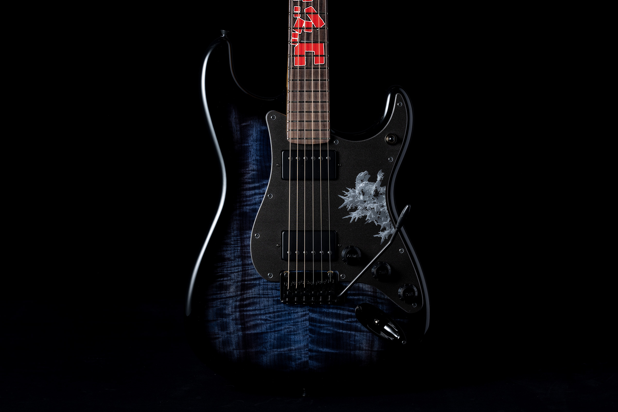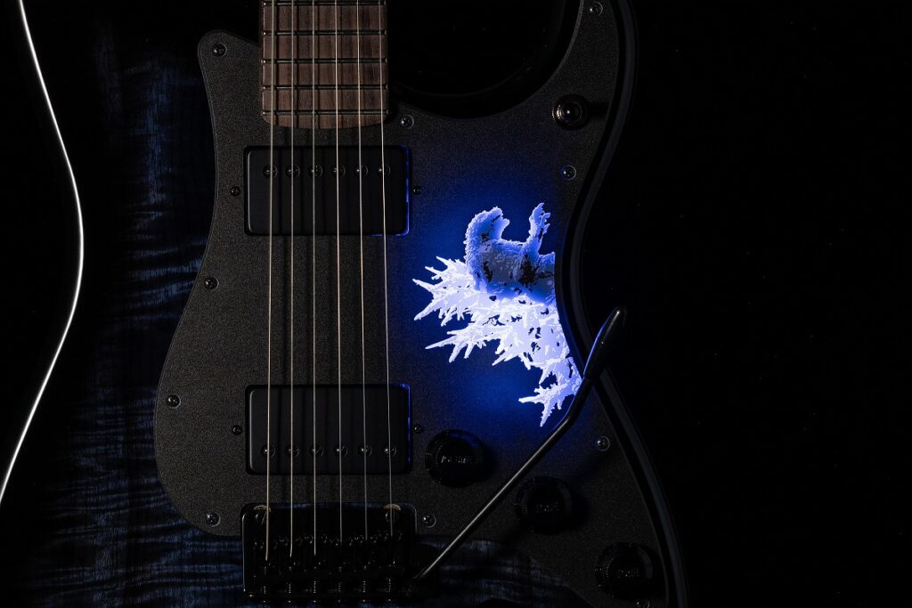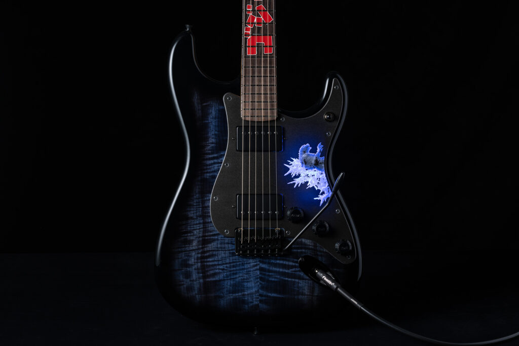 アルダーボディにマートルウッドを貼り合わせ、深みのあるブルーで染色しグロスフィニッシュで仕上げることで、ゴジラならではの重厚な存在感を表現。ネックは“Modern C”シェイプで、22フレット仕様のミディアムジャンボフレットを採用し、指板の12フレット付近には、ゴジラのロゴが大胆にあしらわれており、視覚的にも強いインパクトを与えます。