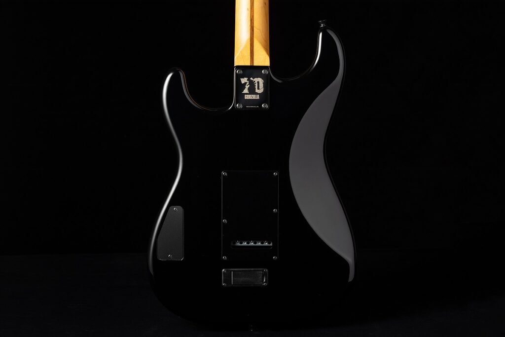 サウンド面にも徹底してこだわっており、Tone2 ノブを押すことで内蔵ディストーション回路が作動。さらに、歪み量に応じて光の強さが変化する「 G.L.O – Gain-Linked Optics」機構(特許出願中) を搭載しています。これにより、ピックガードにデザインされたゴジラの背びれが発光し、歪みが増すほど光量も増加。怒れるゴジラが放射熱線を放つ直前の姿を音と光で表現し、視覚と聴覚の両面に効果をもたらします。