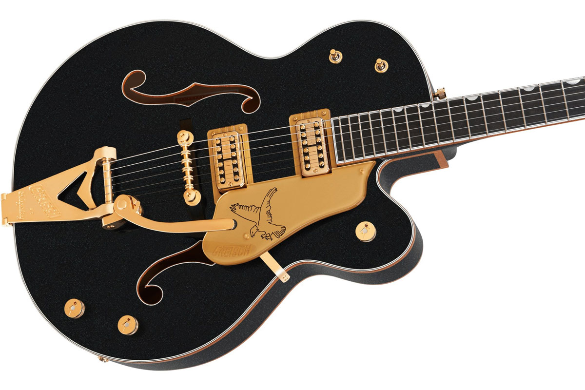 ピュアなトーンと快適な弾き心地を追求し、クラシックとモダンな仕様を融合。ジュエルドG-Arrowノブ、マルチプライのパーフリング付きゴールドスパークルバインディング、パーロイドNeo-Classic™サムネイルインレイ、蓄光式Luminlay®サイドドット、ゴースト処理されたGretschロゴとFalconグラフィックをあしらった厚みのあるゴールドヴィンテージプレキシピックガード、Bigsby® B6GPストリングスルーヴィブラート、ピン留め式エボニーべース付きSpace Control™ブリッジ、ボーンナット、Grover® Imperial™チューナーなどの特徴を備えています。過去から蘇ったような佇まいに、洗練されたスタイルとサウンドを融合したこの1958 Custom Falconは、群衆の中でひときわ輝く存在感を求めるプレイヤーを必ず満足させる一本です。