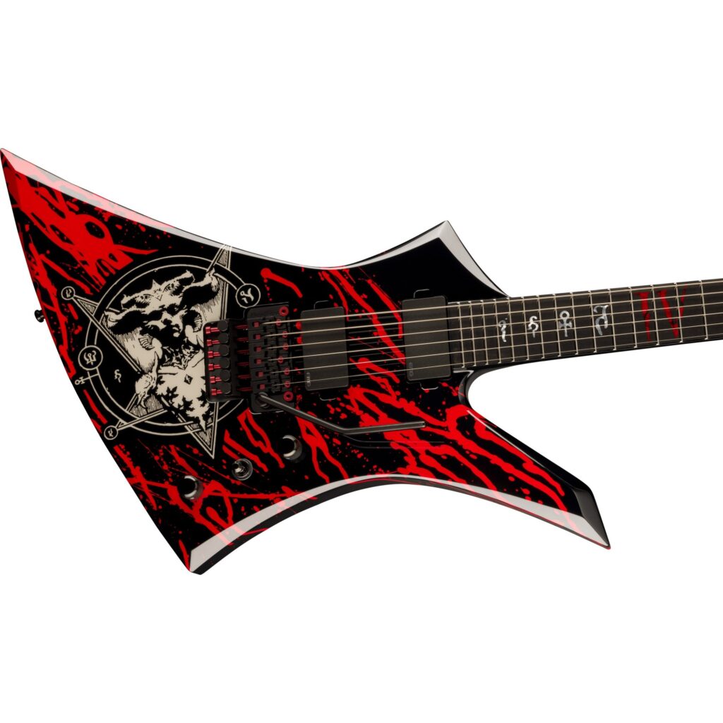 プレミアムなニヤトー材をボディに採用し、ボディ、ネック、ヘッドストックのすべてを包み込むブラッドレッドカラーのバインディングが強烈な存在感を放ちます。スルーボディ構造のワンピースメイプルネックにはグラファイト補強ロッドを内蔵し、圧倒的な安定感とスピード感を実現します。12〜16インチコンパウンドラジアス仕様のアマランス指板には24本のジャンボフレットを装備し、Diabloにインスパイアされたカスタムレッドインレイを採用しています。